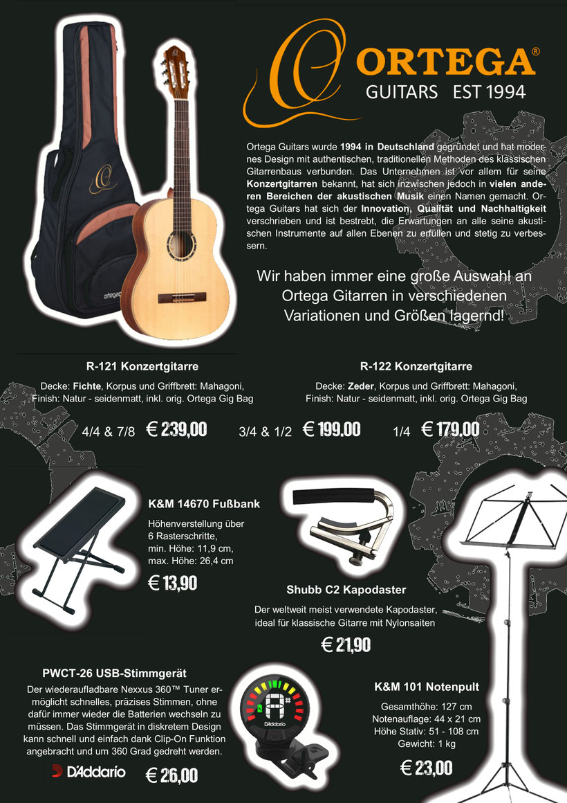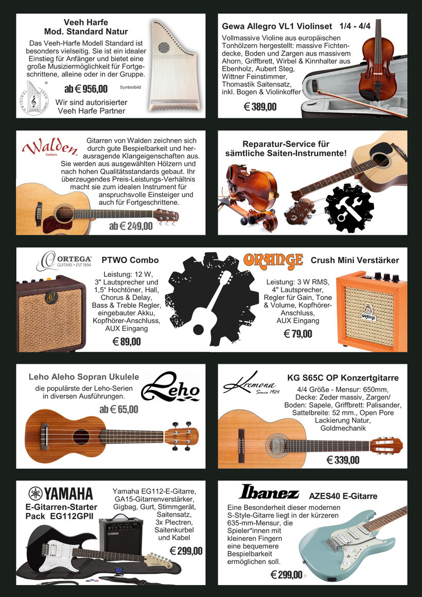 Bei uns findest du alle gängigen Instrumente aller namhaften Hersteller. Zu unseren wichtigsten Partner gehören Yamaha, Hanika, Höfner, Walden, Ovation, Washburn, Larrivee, Martin, Camps, Duesenberg, Fender, Godin, Breedlove, Cort, Ibanez, Duke, VGS, La Mancha, Garcia Lopes, u.v.a.